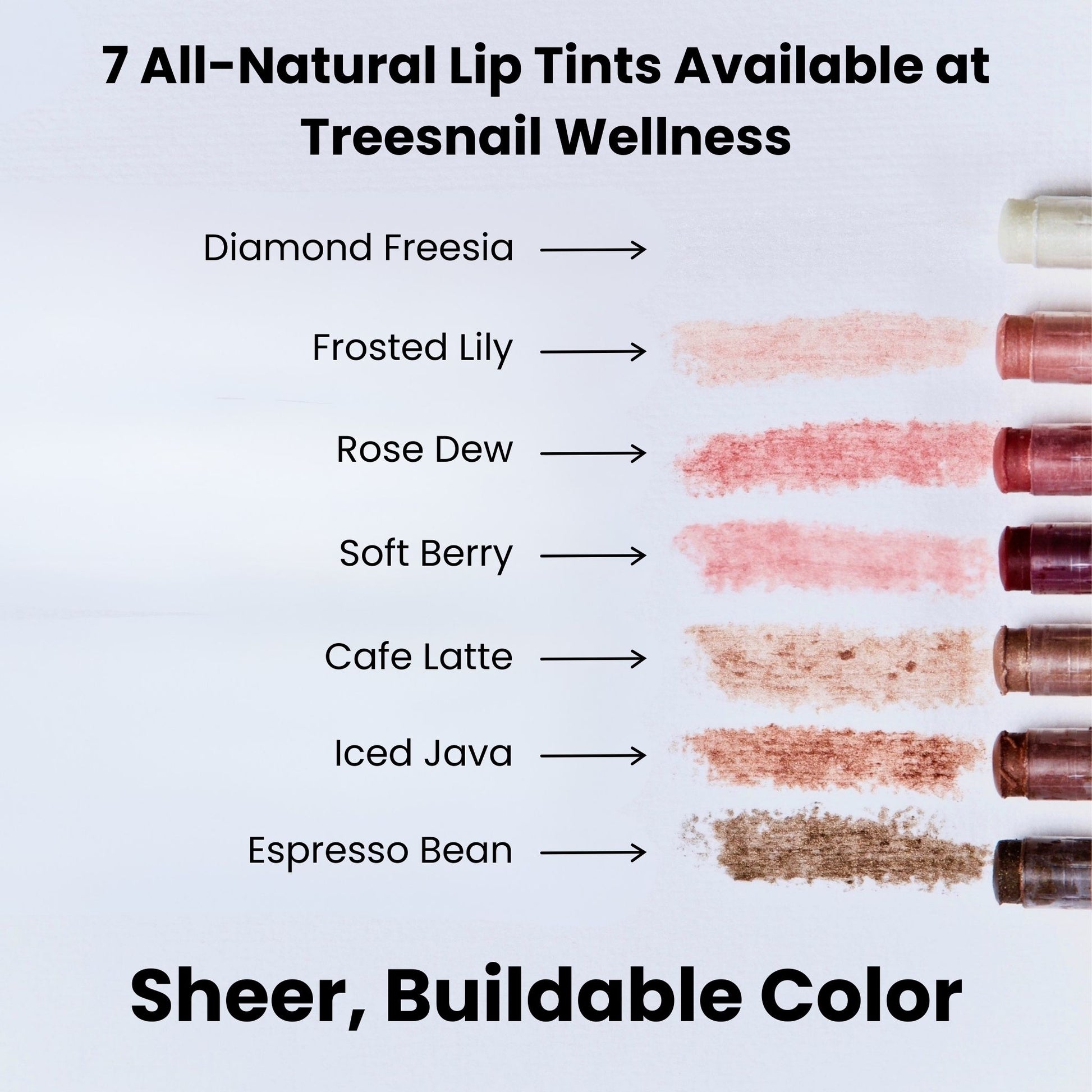 Beeswax (Cera alba), Shea Butter (Vitellaria paradoxa), Jojoba Oil (Simmondsia chinensis), Sweet Almond Oil (Prunus dulcis), Castor Oil (Ricinus communis), Cosmetic Grade Micas (for shimmer shades), Alkanet Root (Alkanna tinctoria) (for Soft Berry), Peppermint Essential Oil (Mentha x piperita), Lavender Essential Oil (Lavandula angustifolia)